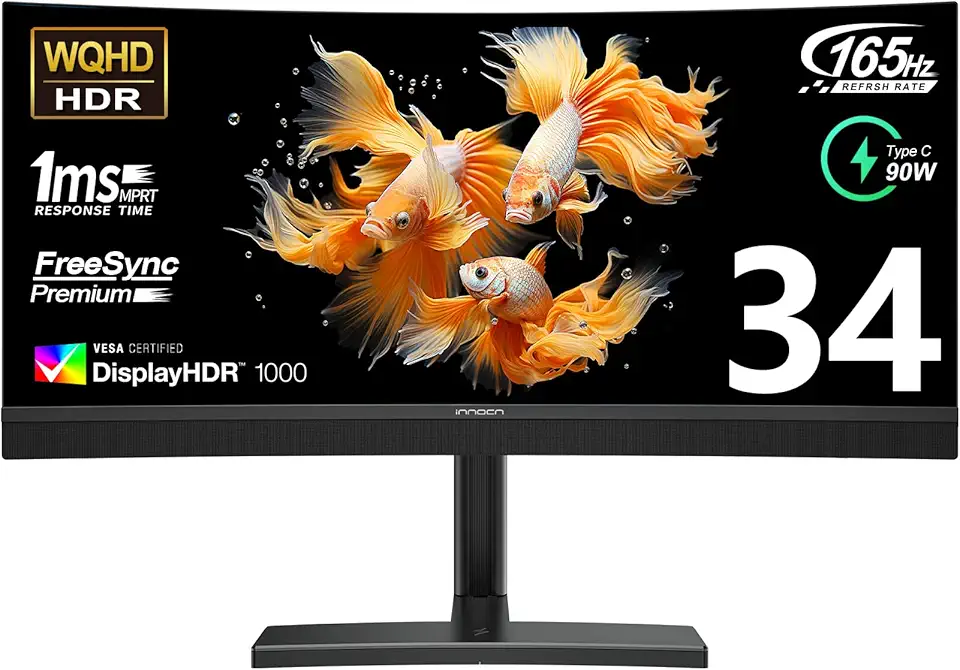 INNOCN 34 Inch Curved Ultrawide Gaming Monitor Mini LED 3440 x 1440p 165Hz PC Computer Gaming Monitor, USB Type C Power Delivery, HDMI, DP, Stereo Speakers, Charger Pad, Black