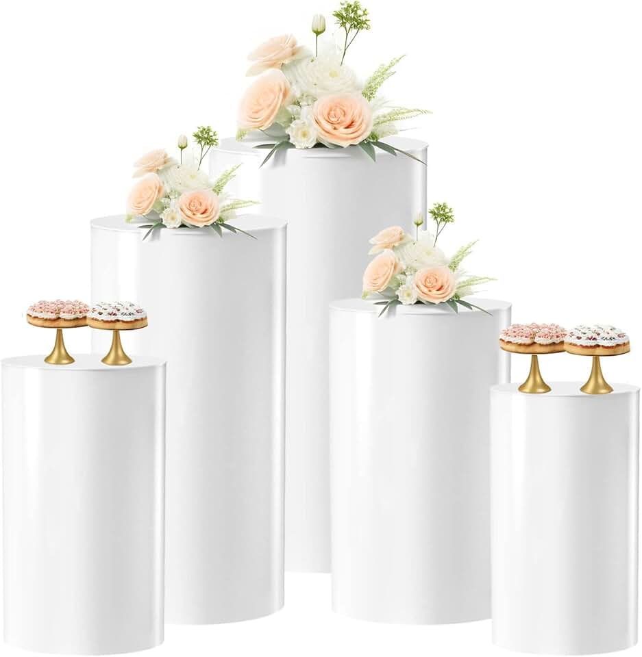 5PC Round Cylinder Pedestal Stands, Metal Pedestal Stand Cylinder Dessert Tables for Wedding Birthday Party, Wedding Centerpiece Birthday Babyshower Backdrop Decor(White-5PCS)