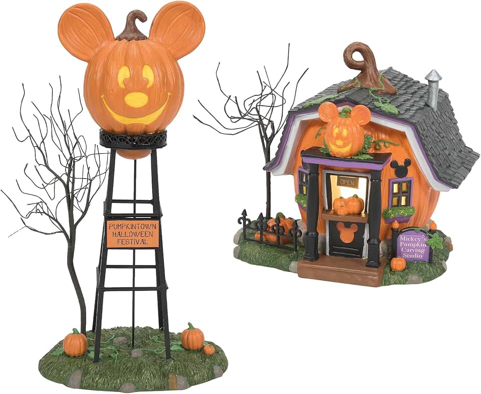 Department 56 Disney Village Halloween Pumpkintown Mickey Mouse Carving Studio Lit Building and Disney Village Halloween Pumpkintown Accessories Mickey Mouse Water Tower Figurine