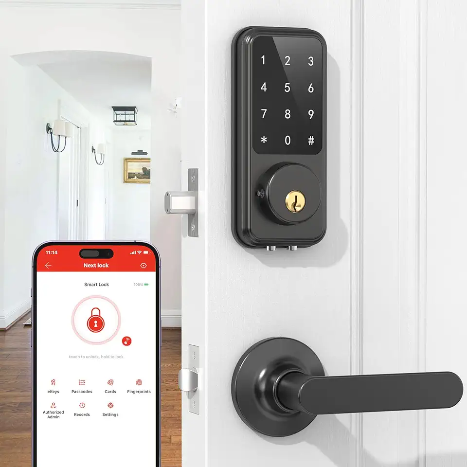 Smart Front Door Lock Set - Smart Lock Keyless Entry Door Lock with Touchscreen Keypads Bluetooth Electronic Deadbolt Lock with Handle with App,Keys,Key Fobs for Apartment Office,Airbnb,House,Black