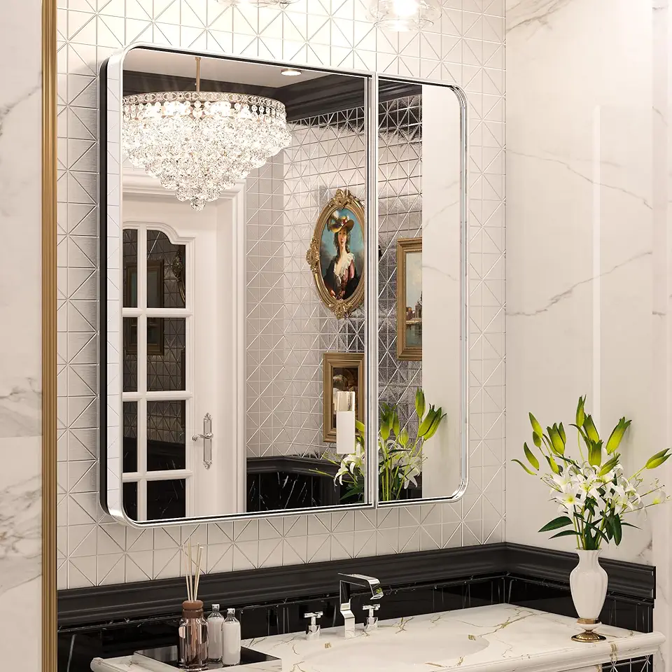 30 x 32 Inch Chrome Medicine Cabinets for Bathroom with Mirror Adjustable Shelves Stainless Steel Framed Double Doors Modern Metal Recessed Silver Bathroom Mirrored Cabinets
