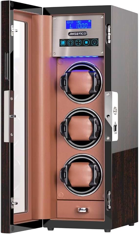 JINS&VICO Vertical Watch Winder for Automatic Watches, Key and Fingerprint Unlock, Glossy Box with Built-in Drawer and Illumination,Flexible Watch Pillows, Fit Lady and Men
