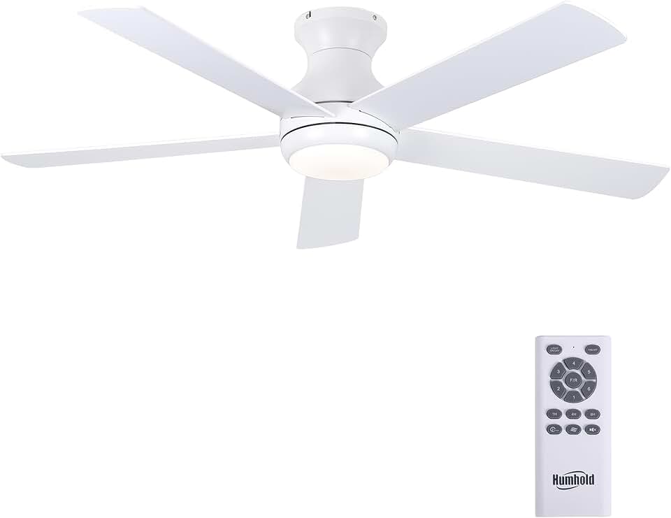 52" Flush Mount Ceiling Fans with Lights and Remote Control, Brushed Nickel, 6 Speeds Reversible DC Motor, 5 Blades Low Profile Ceiling Fans LED Light for Bedroom/Living Room (White)