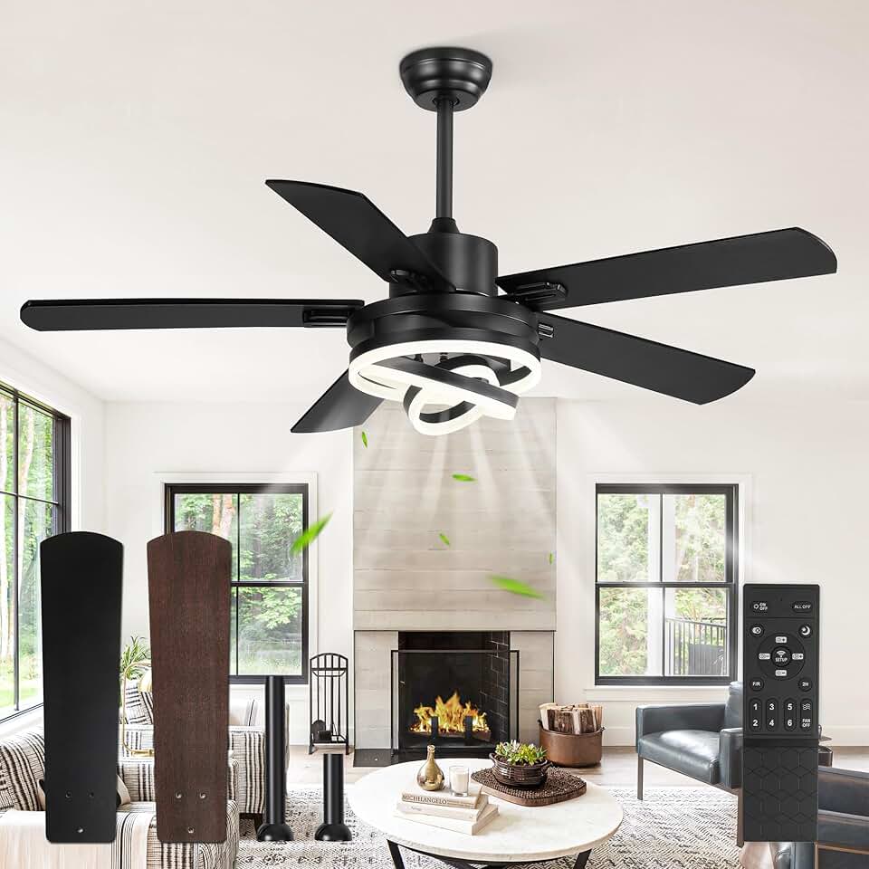 Modern Ceiling Fans with Lights, 3 Wood Fan Blades, 52" Black with Remote Control, Noiseless Reversible DC Motor for Bedroom/Living Room/Study/Patio