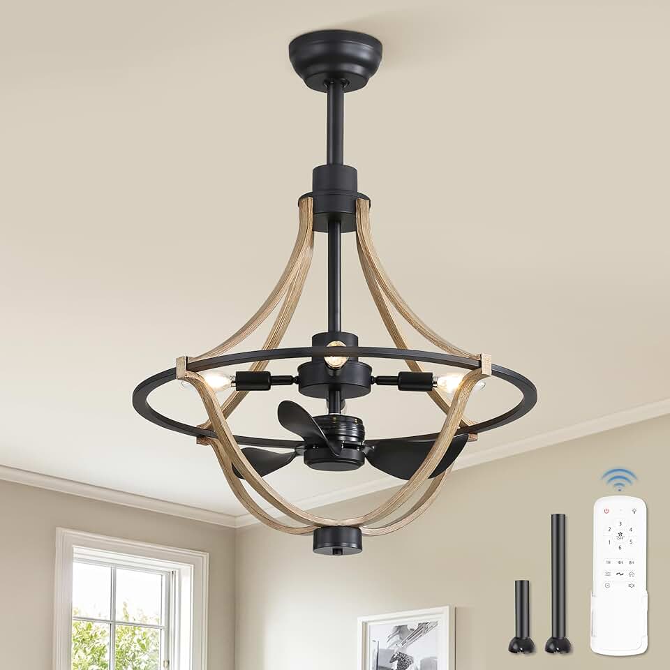 Caged Ceiling Fans with Lights Farmhouse, 18 Inch Flush Mount Vintage Bladeless Rustic Chandeliers Fan Remote Bedroom 6 Light E12 Bulb Base