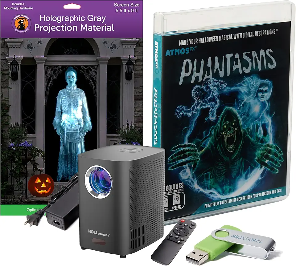 HoliScapes? USB Projector Kit - AtmosFx Phantasms USB + Projector + 5.5' x 9' Large Gray Holographic Screen for Halloween Projection