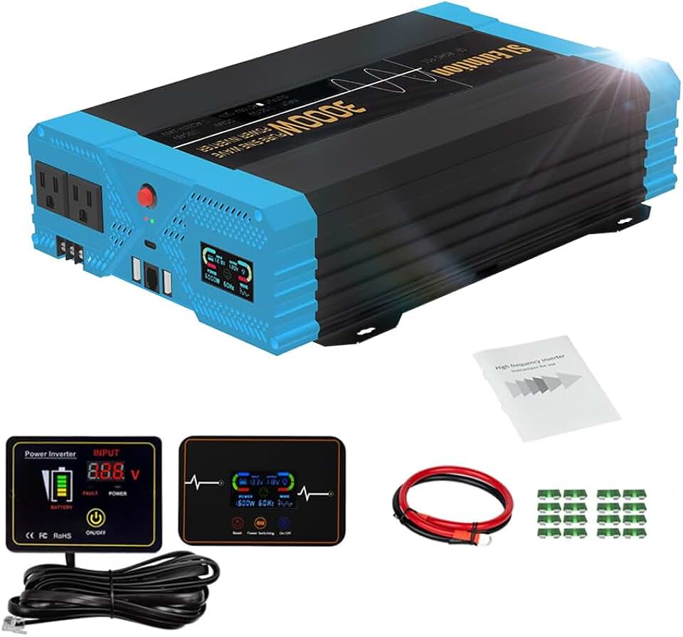 3000W/6000W(Peak) Pure Sine Wave Car Power Inverter 12V DC to 110V AC LCD Display, USB Port, Two Remote Control for Car Home Laptop Truck RV Solar Power Converter