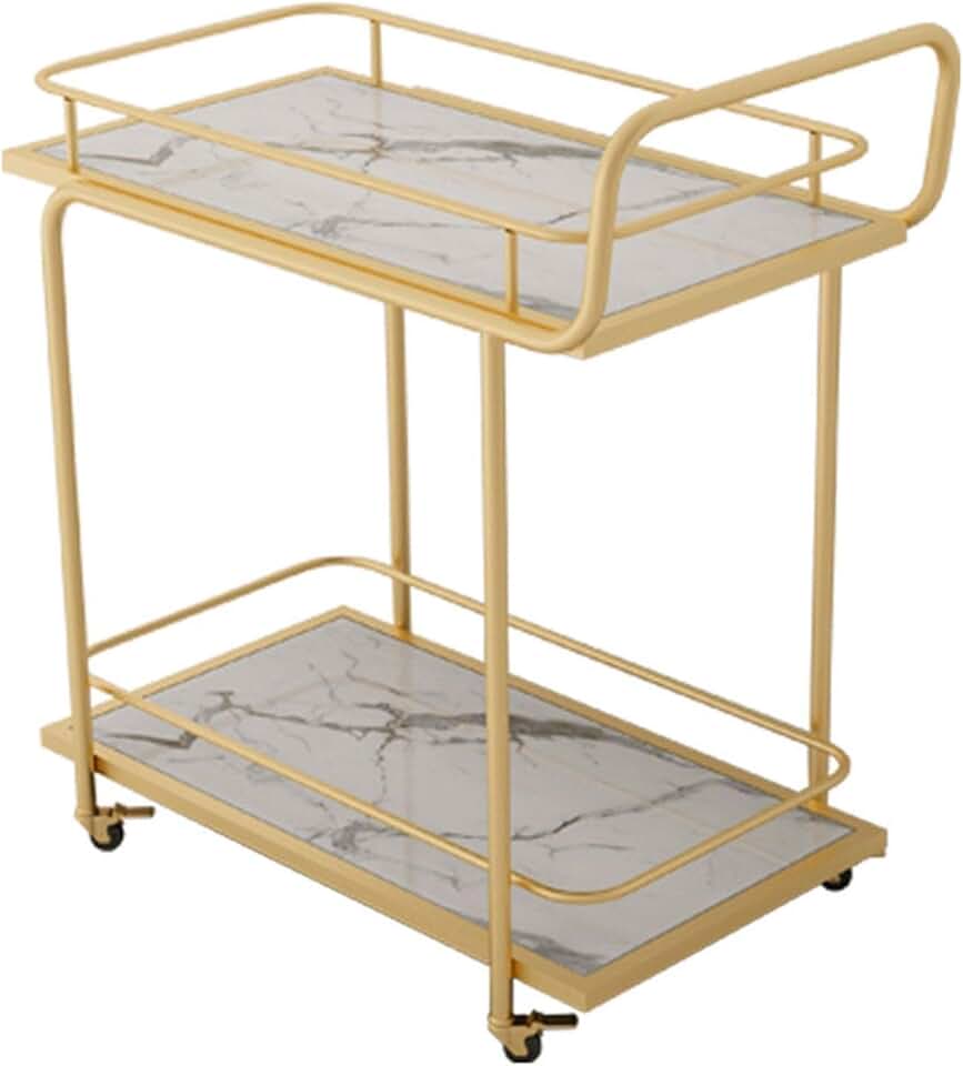 Rolling Bar or Cart for Tea or Cocktail, 2-Tiered Marble/Solid Wood and Metal, Wheeled Home Bar Cart Kitchen cart with Storage (Color : Black Marble) (White Ecological Wood) (White Marble)