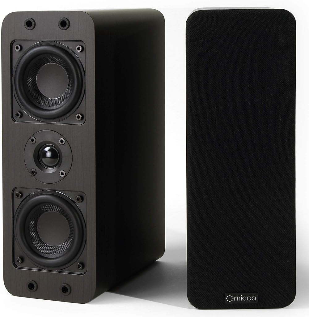 Micca OoO Passive Slim Bookshelf Speakers with 3-Inch Woofers and Silk Tweeter, Thin Design Under 4" Wide, for Desktop Stereo or Home Theater Surround Sound, Wall Mountable, Pair, Dark Walnut