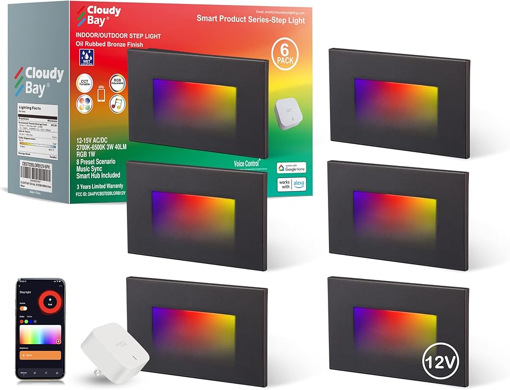 12V Low Voltage Indoor Outdoor Smart LED Step Lights, RGBCW Color Changing Stair Lights,3W 2700K-6500K,Hub Included,Compatible with Alexa and Google Home Assistant, 6 Pack