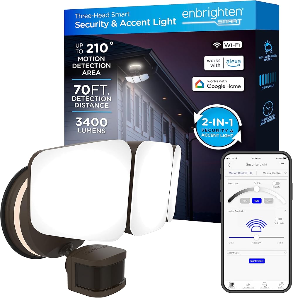 LED Wi-Fi Smart Security Light, App Control, Motion Activated, Three Head, Bronze, ETL Listed, UV Resistant, 3400 Lumens, 4000K, Flood Light for Patio, Yard, Garage, Driveway, 58245