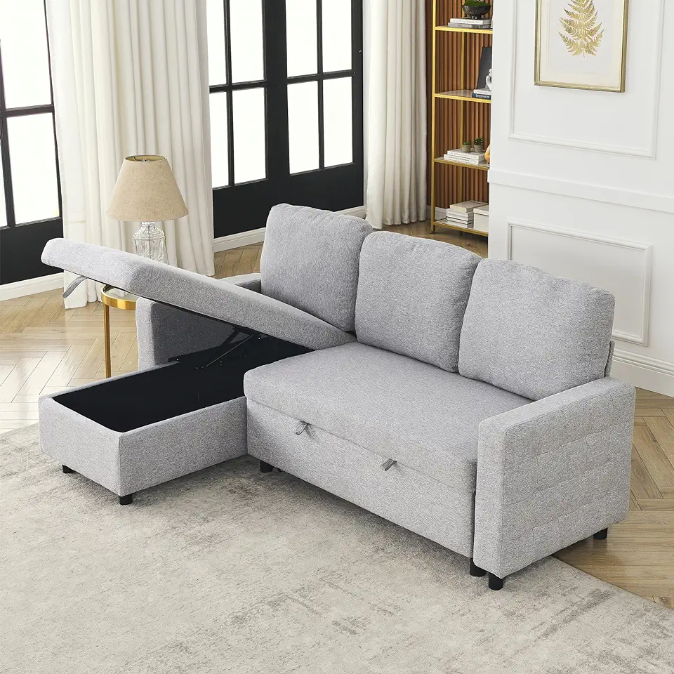 FX 78.8" Reversible Sleeper Pullout, Comfortable Linen L-Shaped Combo Sofa Bed, Living Room Furniture Sets for Tight Spaces Light Gray