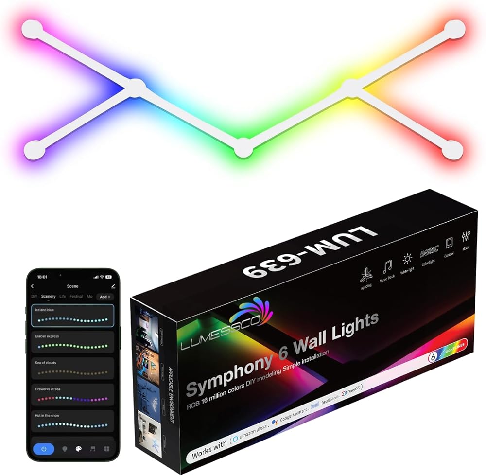Symphony Wall Lights - RGB Integrated Circuit LED Gaming Lights, Smart Home Decor Lights with Music Sync, 40+ Scene Modes - Wi-Fi Control LED Wall Lights, Gaming Room, Bedroom (6 Pack)