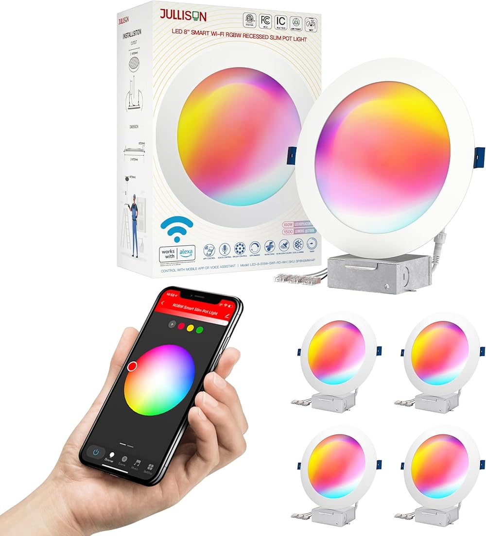 8" LED Recessed Canless Smart Wafer Downlight, WiFi APP & Voice Control, 120VAC, 18W, 1500LM, RGB + 2700K-6000K, ETL & FCC & IC,Wet Rated, Compatible with Alexa/Google Home, White - 4 Packs