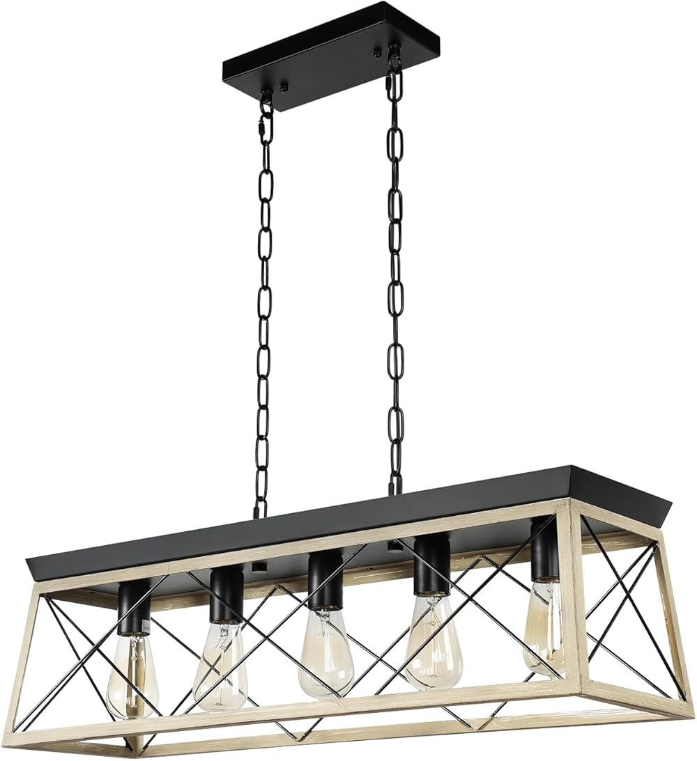 LABOREDUCER Farmhouse Kitchen island Light, Rustic Dining Room Light Fixture, 5 Lights Metal Rectangular Linear Chandelier Industrial Ceiling Hanging Pendant Light for Living Room(Black, Oak Finish)