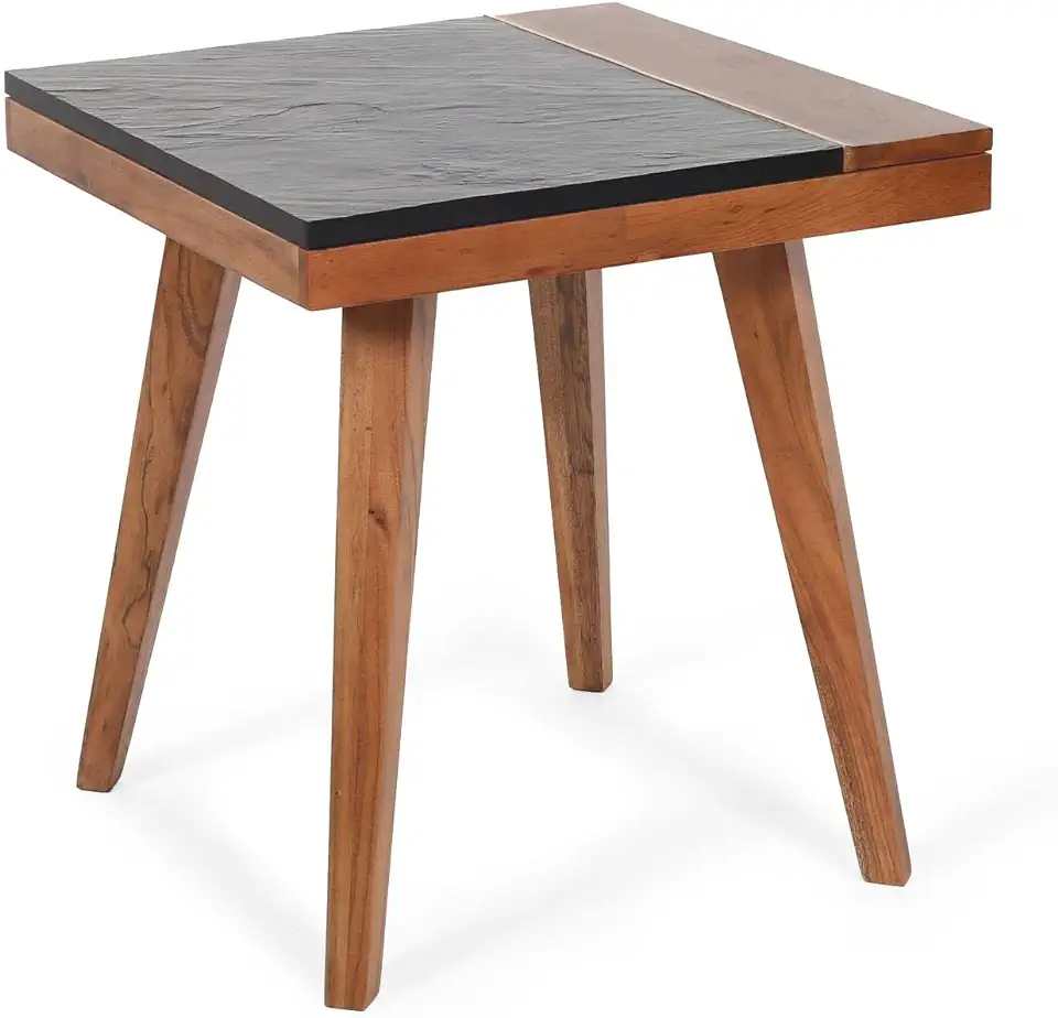 Steve Silver Caspian, Mid-Century Modern Style, Acacia Wood Solids, Slate Veneer, Brass Inlay, Natural Matte Finish, Brown End Table, 19.75 x 19.75 x 21.5