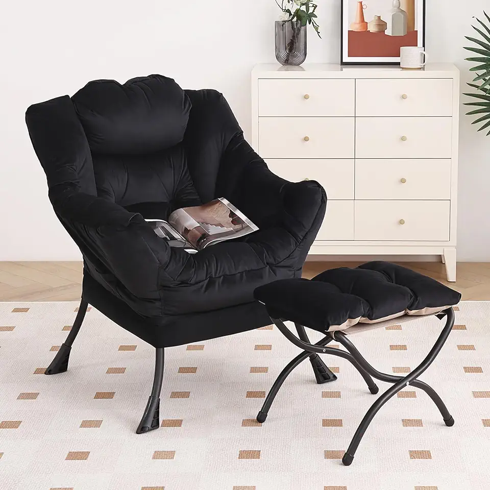 Lazy Chair with Ottoman, Modern Chair with Folding Footrest, Lounge Accent Chair, Comfortable Reading Chair, Oversized Armchairs for Bedroom, Study, Living Room, Courtyard (Black)