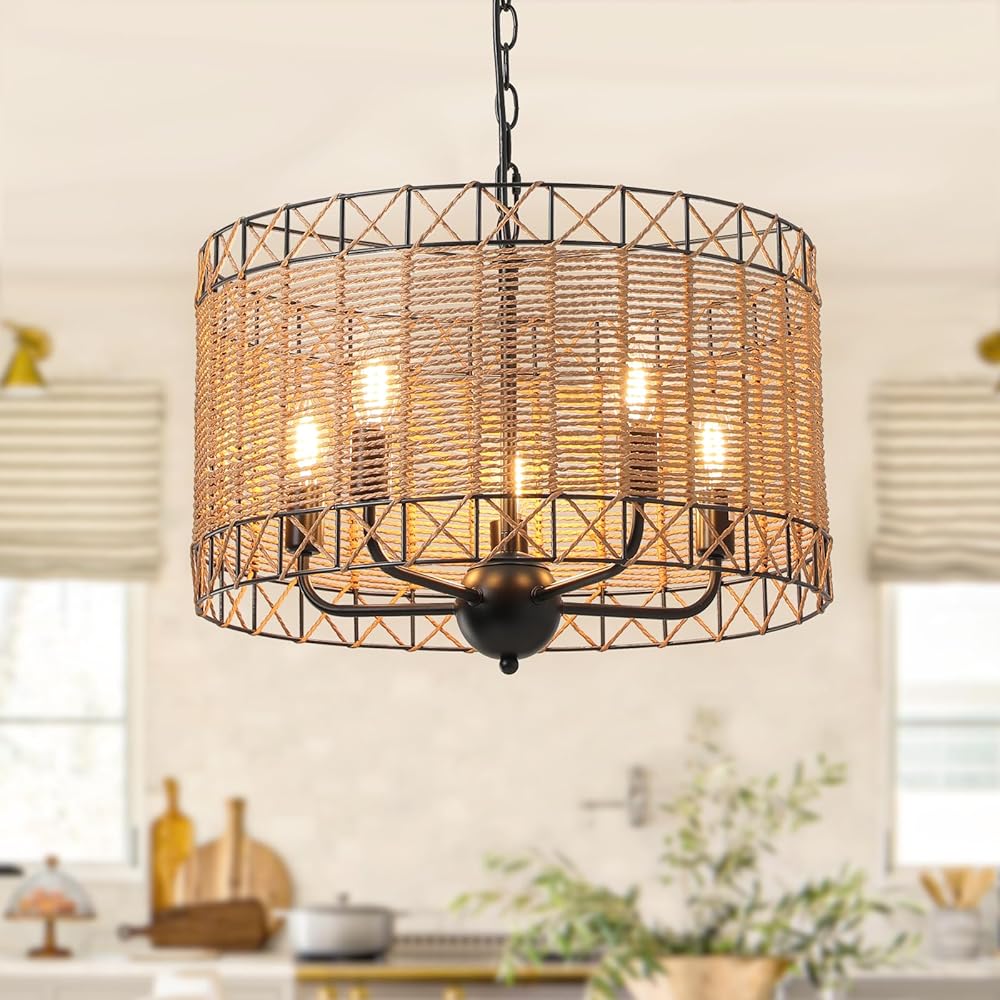 Rattan Farmhouse Chandelier Light: 5-Lights Boho Large Pendant Lights Fixtures - Handmade Woven Wicker Rustic Chandeliers with Fabric Shade for Bedroom Living Room Dining Room Kitchen Foyer