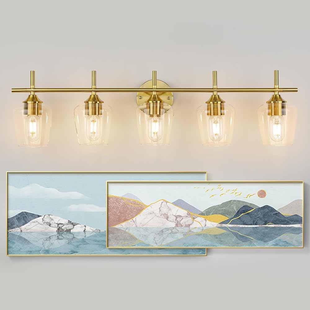 Bathroom Light Fixtures 5 Light Gold Vanity Light with Clear Glass Shade, Brushed Brass Bathroom Lighting over Mirror, Modern Wall Sconces for Bedroom Kitchen Living Room Hallway