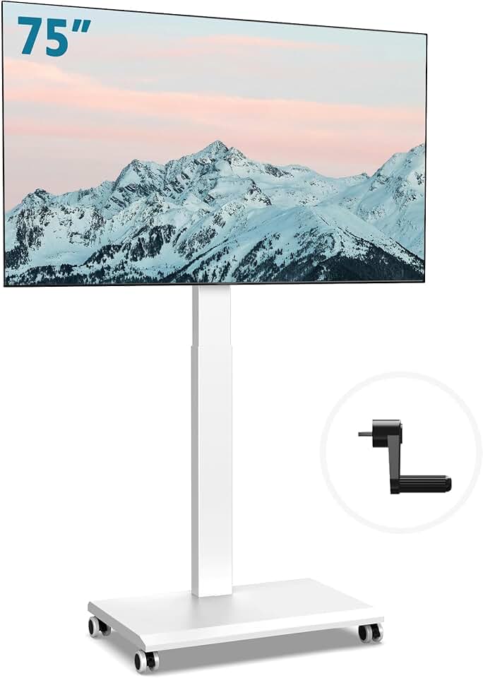 FITUEYES Hand Crank Lift TV Stand with Wheels, Tilt & Swivel Rolling TV Stand for 32-75Inch TVs, Free Height Adjustable Mobile TV Stand Holds up to 110Lbs, Iron Base Max VESA 600x400mm, White
