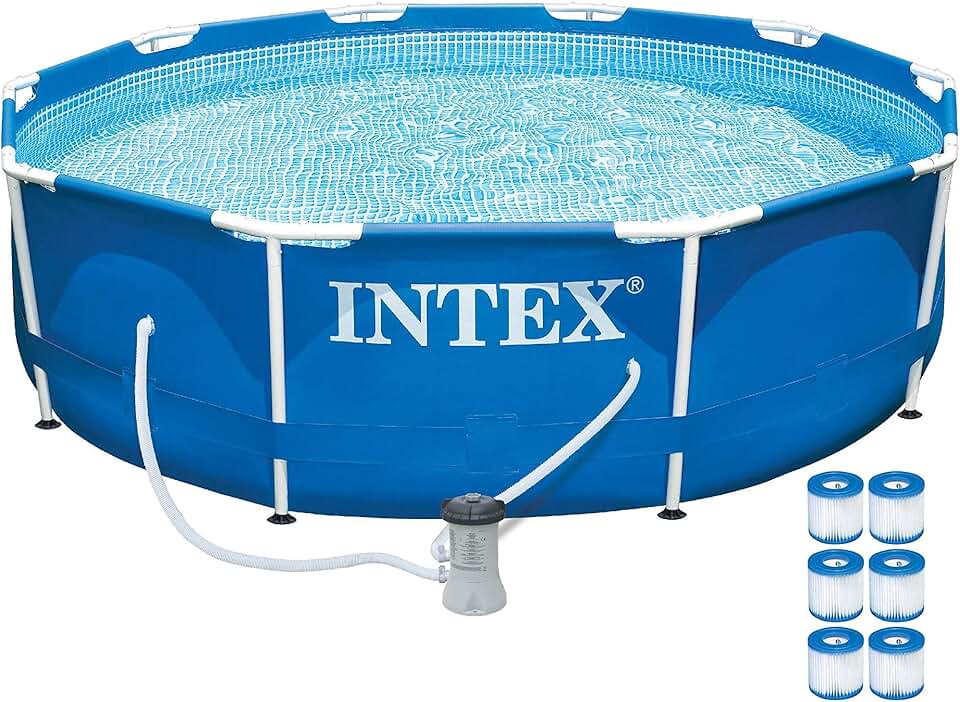 Intex 4 Person Metal Frame Outdoor Above Ground Pool Set with Drain Plug, Filter Pump, and 6 Type H Replacement Filter Cartridges, Blue