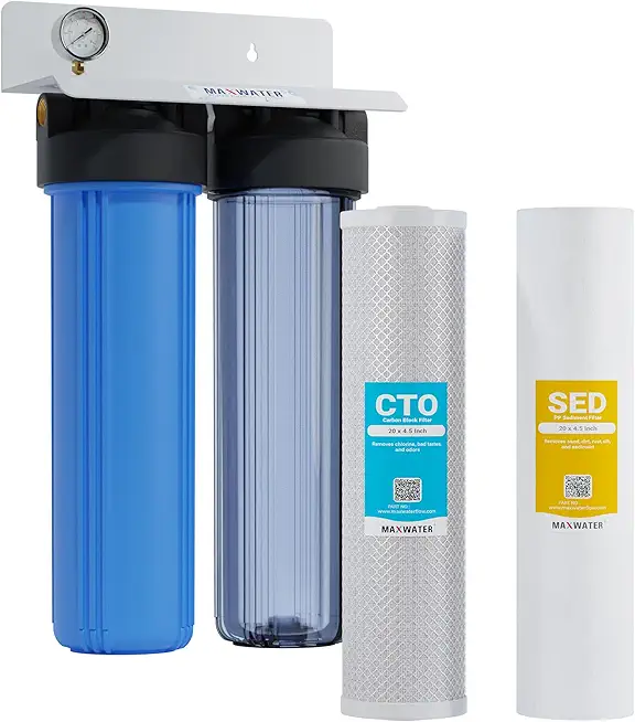 20" Dual Clear & Blue Whole House Water Filter 1" w/Pressure Gauge, Double O Ring Filter Housing, 20"x4.5" 5-Micron Sediment, CTO Carbon Water Filters