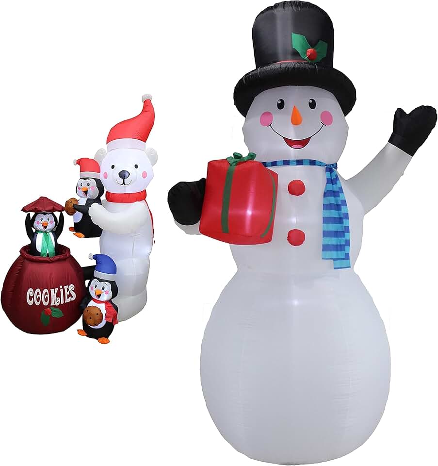 TWO CHRISTMAS PARTY DECORATIONS BUNDLE, Includes 6 Foot Tall Animated Inflatable Polar Bear and Three Penguins Cookies Jar, and 12 Foot Tall Inflatable Huge Snowman with Gift Box Outdoor Indoor Blowup