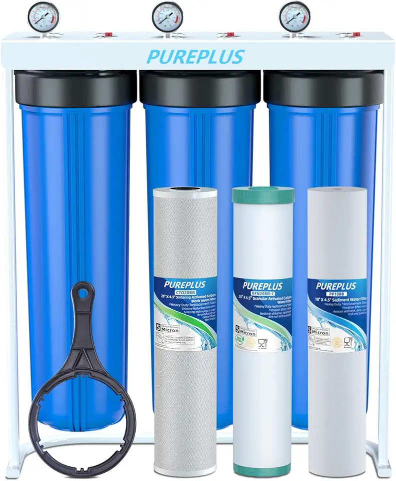 PUREPLUS Whole House Water Filter, 3 Stage 20" Home Water Filtration System, Sediment, Granular Activated Carbon, Carbon Block Filter, Includes Pressure Gauges, Freestanding Steal Frame