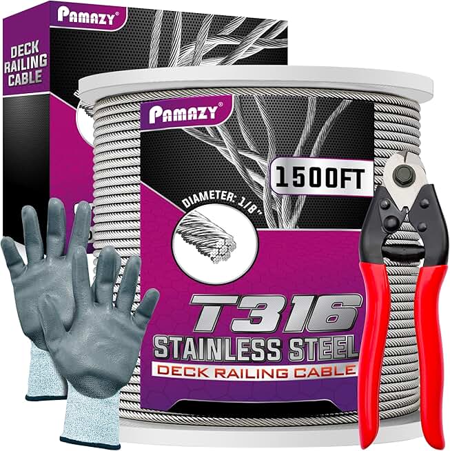 1500FT 1/8” T316 Premium Stainless Steel Deck Cable Railing Kit with Cutter & Gloves, 7x7 Strands Construction, Cable Railing Hardware System, Stair Railing, Wire Rope Aircraft Cable for Hanging